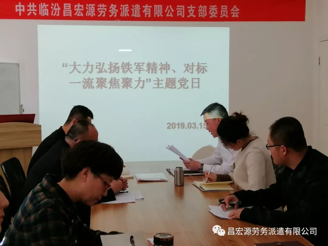 3月15日下午,臨汾昌宏源勞務(wù)派遣公司黨支部開展了“大力弘揚鐵軍精神、對標(biāo)******聚焦聚力”為主題的黨日活動。