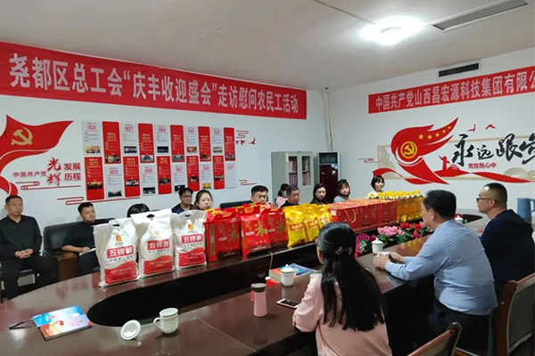 2022年是黨的二十大召開之年,是進(jìn)入全 面建設(shè)社會主義現(xiàn)代化國 家、向第二個百年奮斗目標(biāo)進(jìn)軍新征程的重要一年,也是鄉(xiāng)村振興全 面展開的關(guān)鍵之年。為慶祝第五個“中國農(nóng)民豐收節(jié)”,9月28日下午,臨汾市堯都區(qū)總工會開展以“慶豐收 迎盛會”為主題的慰問農(nóng)民工活動,區(qū)總工會主席秦奇杰等一行人來到我們山西昌宏源人力資源股份有限公司對13名農(nóng)民工進(jìn)行走訪慰問,為我們送來米、面、油、小米、五谷雜糧等慰問品。